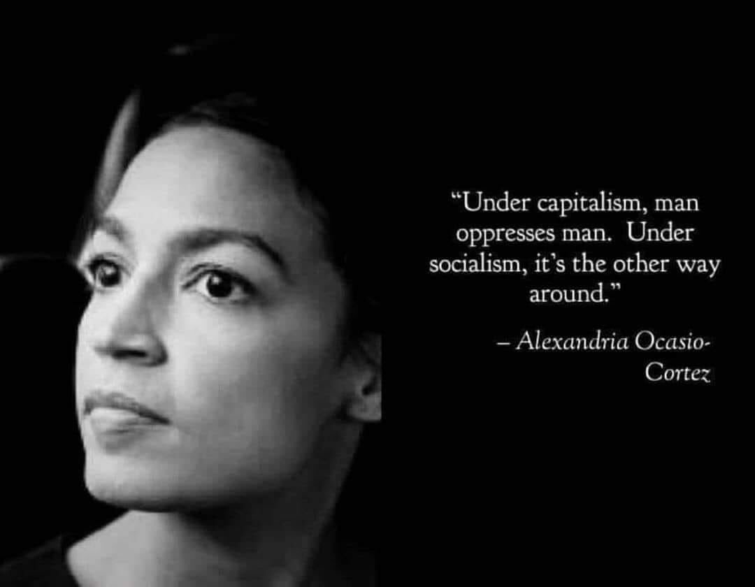 WDMSO, where would the state get the money to pay you, if it weren't for "capitalism"? Do you understand, that not everyone can be a public servant? Not everyone can take public tax money, SOME people have to be out there, generating wealth to be taxed for you. And she says it's "irredeemable"? I'll be the very first person to say that capitalism is flawed, but it's not sinister for Gods sake. AOC is a complete, total moron, she's the living embodiment of the word "clueless".