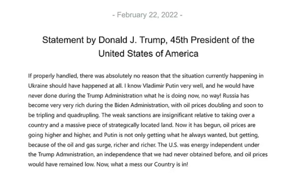 Full Trump statement. Does not include condemnation of aggression, call for sanctions, or other consequences
