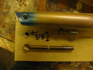 heres a pencil with a hollow mouth, with a slug of lead in the butt. its funny. with a 1/0 treble on the back it sits verticle and has a more of a pencil type action. with the 4/0 siwash on there now it sits at about a 45-50 degree angle and pops more, but still has the walking action.