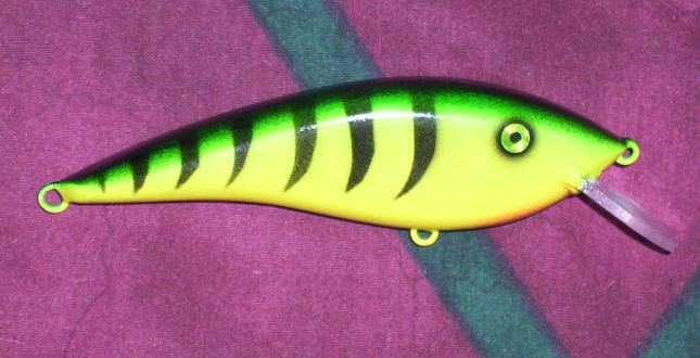My nephew Matt want's to try plugging for pike and asked if I could make him a firetiger shad/minnow. It still needs another coat of epoxy, but it'll have to wait until the next go-around(hopefully this weekend). I made it the same as another hand carved that swam really sweet(nice tight wiggle and dives down deep if you crank it quick, but can still work up top if you want) and this one is the same. The only difference is the first one was homemade screw eyes, and this one's through wired. It's a shade under 5" nose to tail, and weighs somewhere about 1 1/2 oz. I cheated and used a stencil for the stripes, but I really like the improvement in paint control with that VL over the old single action I was using! The eyeshadowing didn't blow out all over the place this time! I still need more practice before I trust myself with freehand work, but it's coming along finally. I was starting to get frustrated with airbrushing but now I like it again!