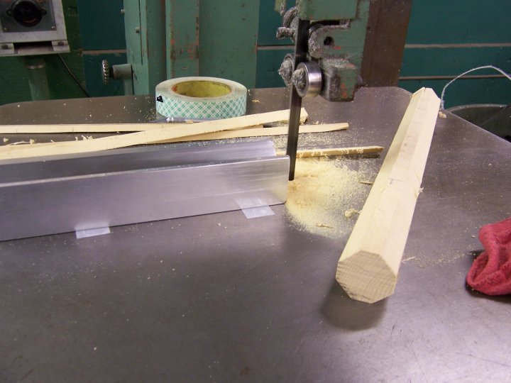 With several people using the home made type duplicator now I have a simple jig that will take the nerve wracking aspect out of the turning process which is turning square stock with a hand pressure tool. The edges. I know that it looks like a small amount of material being removed but it makes a big difference with this type of duplicator. It will save you time because you don't have to go so slow in the beginning to get the stock round. I do all my stock this way at once when I buy it. So when ever I need stock I just grab it and it is pretty much round already, octagon actually but much easier to use. 2 fast passes and I am round. No slow going to get to that stage. I do any length from 8' to small individual pieces. Now I know I am using an industrial grade band saw with a big table but you can bolt on a larger work surface easy enough. You might not have to. I made my jig out of aluminum but you can do the same with wood. Tilt a table saw at 45 and you have a V block. Make it long so the stock will be supported well. I have tried just using a table saw to cut off the edges of the stock. It will work but I found it to make a hell of a mess and dust bowl in my cellar not to mention kind of dangerous to the fingers.