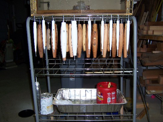 the spray booth is made from a pair of clear storage bins, the small one is a filter box, it contains fiberglass and charcoal media... keep in mind, because I use the air flow from my dust collector, only non flamable paints are sprayed into it... all other flamablees are sprayed outside...