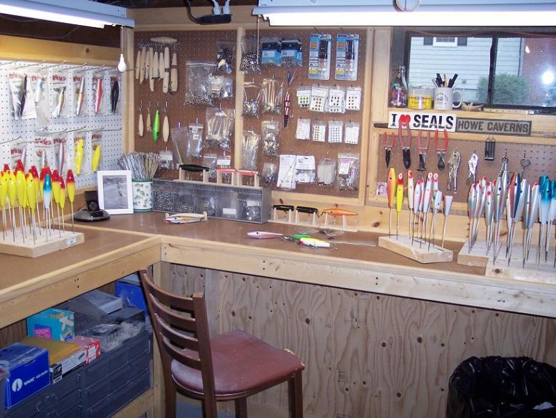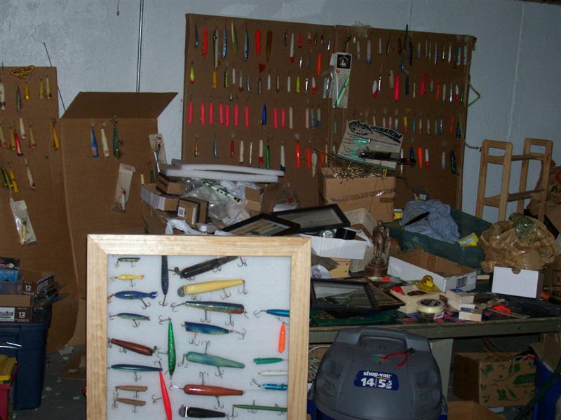 Here are a couple of pics of my caves. The first pic is my indoor cave. It is the room that is under an addition to my house. It is a good size room, about 16x24 and as you can see nicely organized  It is where I store all of my rods, reels, plugs and my fresh and saltwater collection. The pic only shows a small part of it, but the rest is the same. It is on my list to get cleaned up later this winter so I can work on plugs and stuff in there, and display all of my stuff properly. I haven't done much work down there because of the mess plug building makes but I just got the big dust collector from jet so I may give it a shot.