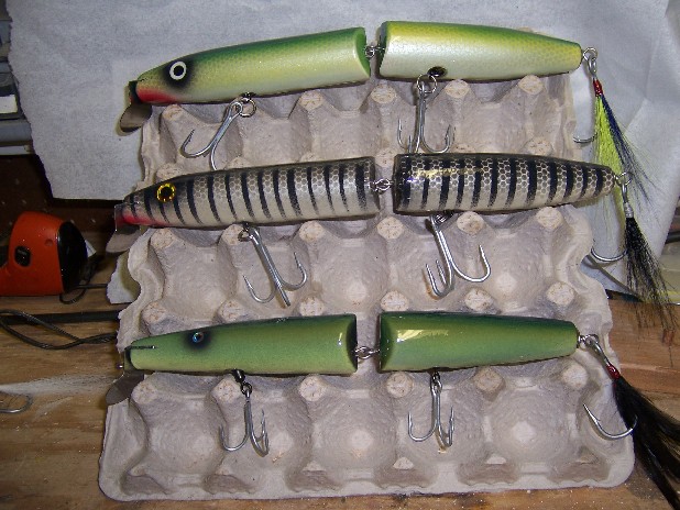 Here's another copy of a Russo flaptail, s 1.5 ounce swimmer witha tattle and glow in the dark eye and a small danny, alkso a trio of big jointeds, the shaved head eels fetures a rattle in the noggin.. more latter this week after I epoxy and assemble them...