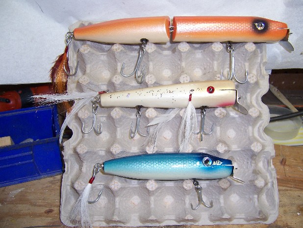 I've been busy for sure, lot's of stuff still "curing" I'll be painting all this week.. I've got three sizes of needles, three sizes of pikies and surfsters, 40's and eel skin Jr. as well as some "tricked up" Copies of Capt'n Bills swimmers all to be finished...