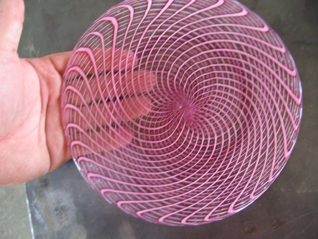 Then you lay aprox 30 lenghts side by side on a cast iron plate that is coated with silica and alumina so it wont stick and heat it up in the furnace until its sort of soft. Roll it up on the end of the pipe, close the end (you now have a striped bubble) and twist it counter clock wise, then blow it out to a wine glass shaped cup- Put in an oven at 1200 degrees... then repeat the whole proccess all over agian, but twist the bubble exactly the same way as the first cup, but in the opposite direction... Blow that cup into the 1st cup.. heat the crap out of it so that the trapped air pockets pool up into round bubbles.. transfer the cup to another pipe, trim up the bottom to crisp up the pattern... blow it out to the final shape. Transfer to a pontil, open the lip and flare out to a disc....