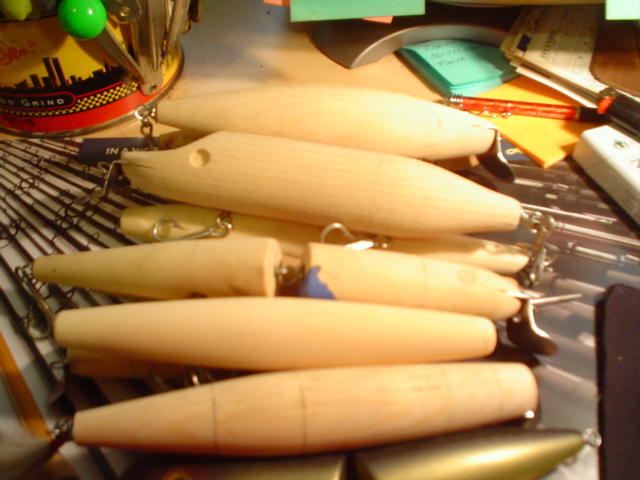 like the skinny profile ,,, is it rolly ? You get it to swim ... That little dark one with the big eye is interresting .. Lots of unfinished stuff there .. Looks like the Proffesor's cave . I thought he was going commercial making plug kits ..