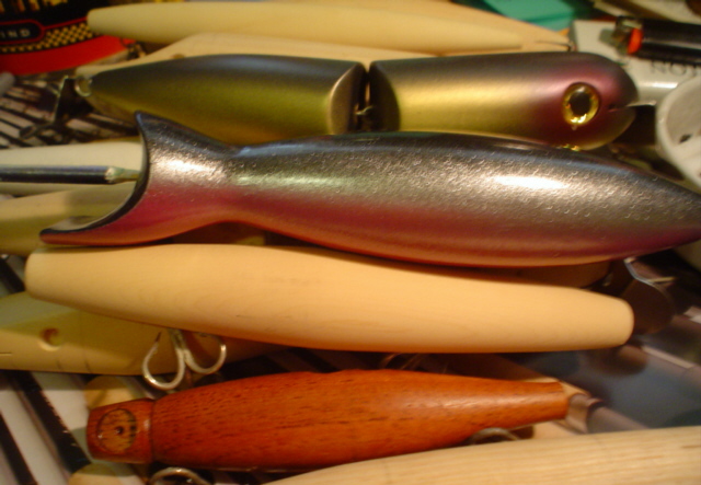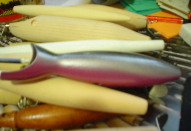 like the skinny profile ,,, is it rolly ? You get it to swim ... That little dark one with the big eye is interresting .. Lots of unfinished stuff there .. Looks like the Proffesor's cave . I thought he was going commercial making plug kits ..