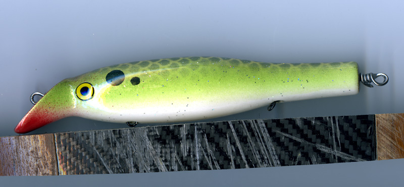 Here is the belly wgt location and the hook locations. You can get dim. from first post blueprint. Tail wgt is 5/16 dia by .600 long. I would drill the front belly hook hole for a large grommet as you will need a long swivel to reach the thru wire, thus it will be a bigger diam. swivel, as it is a pretty fat plug at that point. The original used screw eyes. Thru hole is drilled on center. I put a 1/4" c'bore on front angle to allow for a smoother nose grommet fit. I bandsaw angle and sand in the final dim. at 40 degree angle. This plug will swim pretty deep and with a very nice wiggle. It is a winner and I like this size better than the larger size but that is just my opinion.