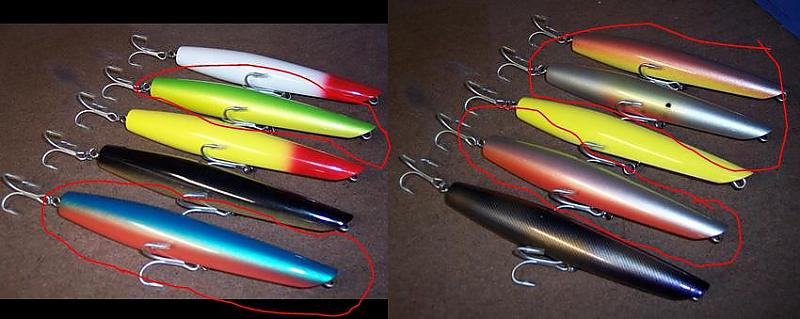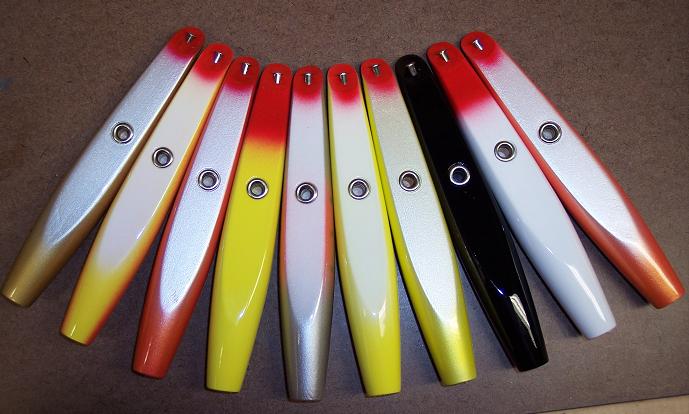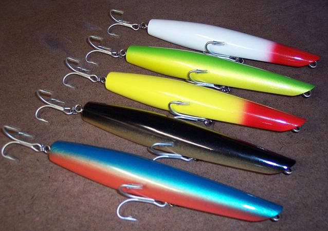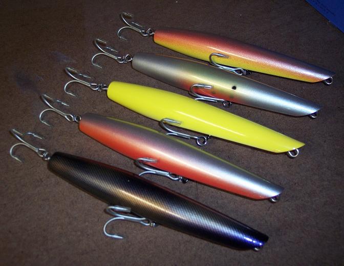 These are a very short limited run of Canal Pencils that I just finished! They are 7 inches long and weigh 3 ounces! 3/0 VMC's and triple split rings! These will not be available in shops this season....but they are available right here on S-B!  They cast a mile and are a striper slayer! They sink, they do not float! I took these down the canal last week (I have never caught a "Canal Keeper" before....many of you know the Canal and I do not get along!) I probably caught at least 10 keepers between 15 and 26 pounds......lost a "Bunker" pencil to an absolute "SLOB"! It slurped the pencil down and ran like a freight train.....I never had a chance! So look for the 40 pounder+ with a "BigFish Bunker Canal Pencil" in its maw! These are priced at $23.00 each plus $4.00 shipping! Colors are as follows!