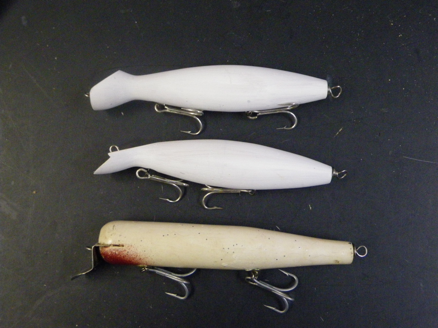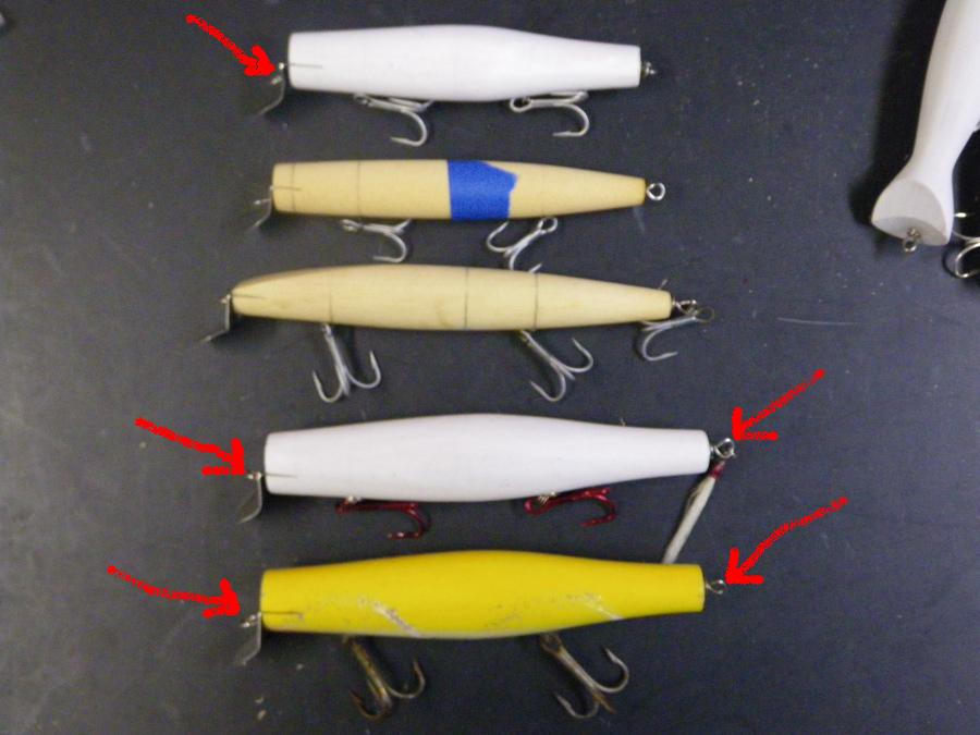 That big white one with the red hooks was the problem child. It has a tail weight to compensate for the absence of a tail hook and this set up worked great in the smaller white proto at the top. The BM is a heavier plug and floats very low in the nose without the tail hook (and fished very well that way). But even when I added weight and changed lips (I cut several different shapes) and bent wires up and down that white plug wasn't right at the speed I retrieve them. I think it is the planing action of the body that is wrong.....something I'd never thought about in swimmers previously (in needles and spooks it matters) and which is why I posted about it. I suspect if I loose the tail weight and upsize the front hook I can make it work. It will cast worse, however. On the next run I'll put some concavity into the front of the body and try again.