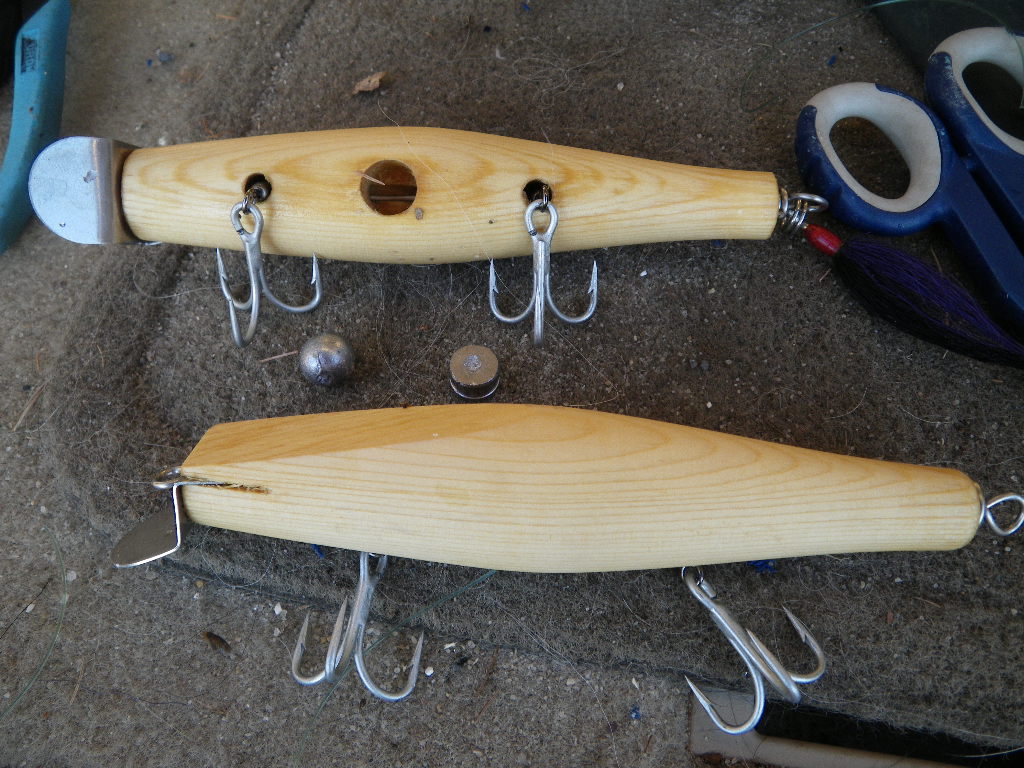 Subsequently I fished it, tweaked it, and have ended up with a plug that has taken several fish over 40-47 lbs for me and a few friends. The plug swims so poorly that I've stopped giving them away since guys would swim it once, decide it was crap, and never use it again.