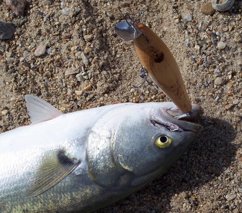 Took some of my Dad's (Plugbillder) new plugs over the the Reserve Channel in South Boston today. Larry-Thanks for pushing about testing. The Flaptails were great, just like I was told on the Lido thread, the flaptail on the swivel spins, pops up and thrashes the surface, WOW!. The one just attached via split ring just wiggles. Going to change that one to a swivel as well. These will be deadly, at night, among boulders. Heck, they lok so good they could be deadly anytime. The bottle neck swimmer, really nice wiggle action about 3 feet down can't wait till a nice heavy surf for it. The metal lips both dove nicely with a nice wobble motion. Also, several of the plugs he turned since Plugfest now have scale patterns (he is experimenting with several kinds of mesh) as well as micro glitter. He learned a lot from you guys from talking and observing at Plugfest and it shows.