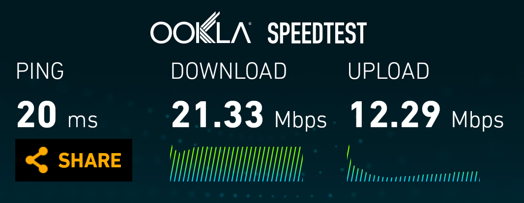 Wireless/Comcast: 3 tests Ping 35ms, Download ~21, Upload ~5.5