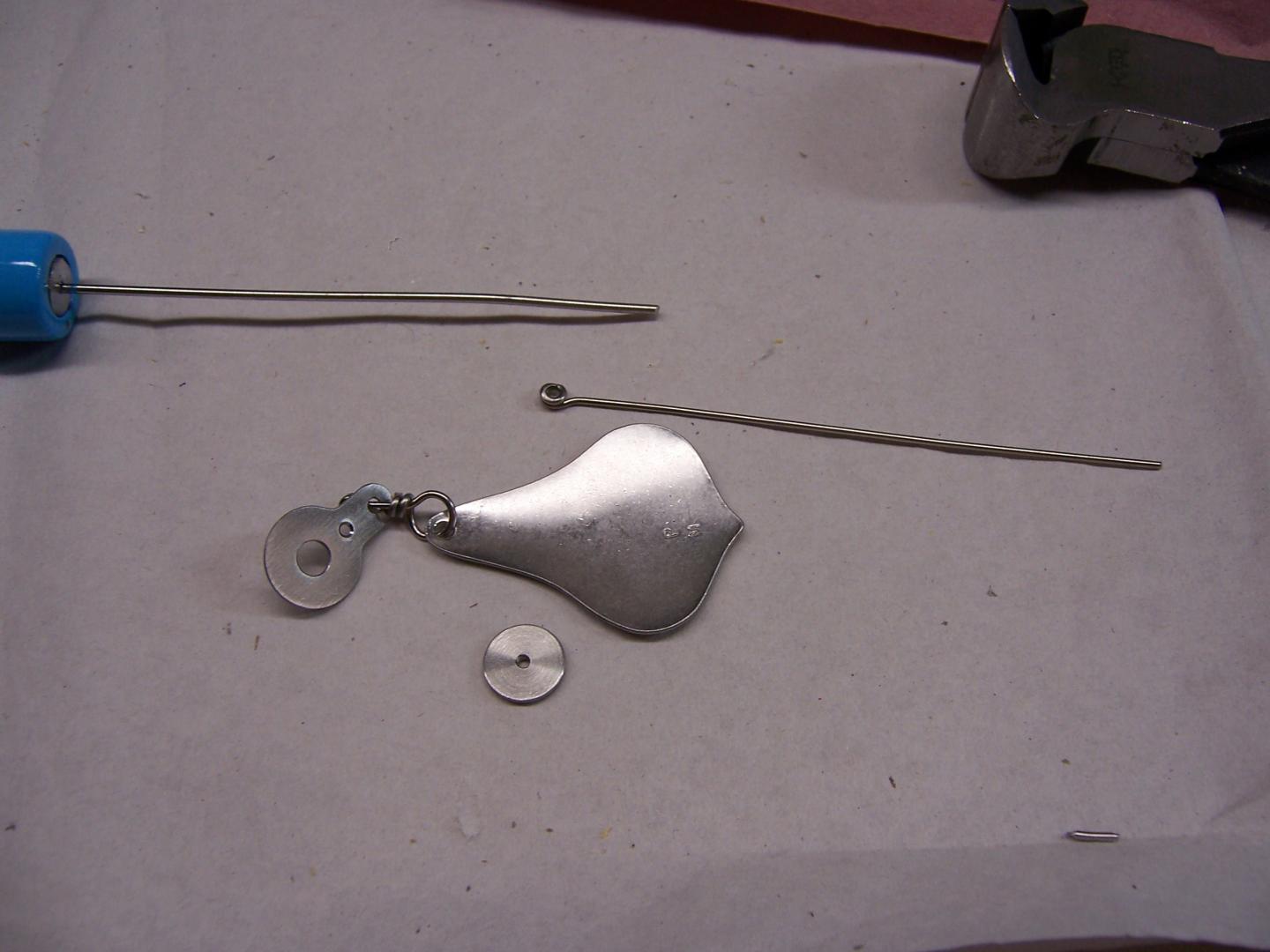 Here are the flaptails and the components I use to make up the assembly. I will no longer make the grommets as I will modify the hangers to accept a regular grommet. The pins are small stainless nails that I modify so they sit into a countersink in the hanger and are thus flush to the hanger. The flaptails are available from several suppliers. The hangers are not so you will have to hunt around to find something usable or make your own.