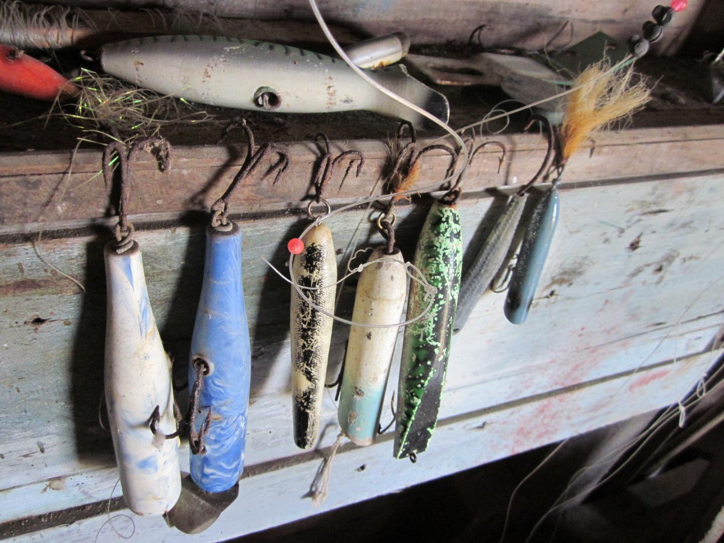 couple atom 40's, a cordell pencil, a chub creek? and a musso darter? and a gibbs bottle swimmer. found in the garage and arranged by me  So theres evidence ppl caught fish here........................................