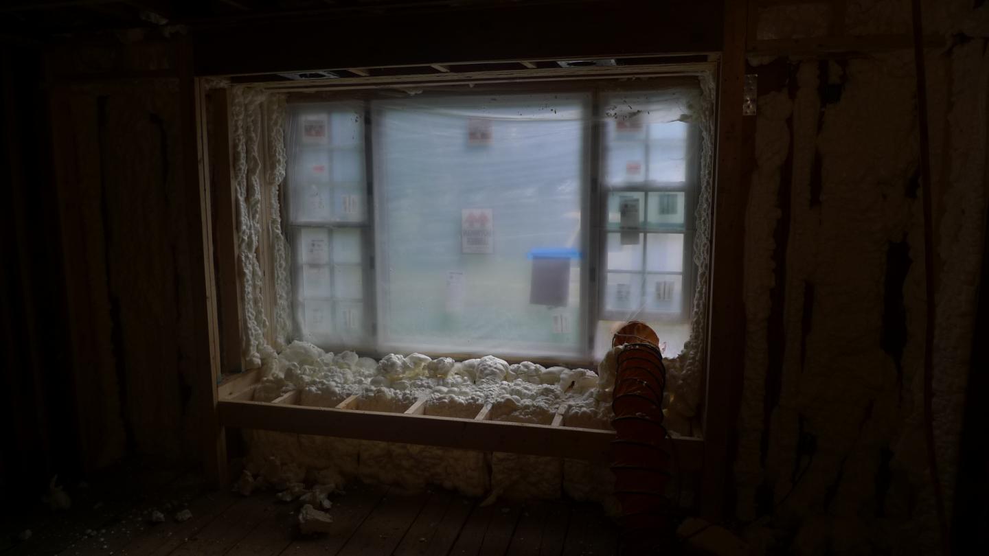 They spray it in the "bays" and after it expands/cures they shave it off flush with the front of the studs with a saw. The out-gasing from the previous generation of foam is no longer a problem...