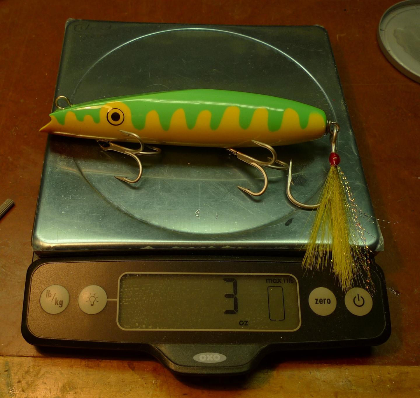 For the needles I follow the same weighting as the plastic superstrike needles. Take a good look at the low wt placement behind the belly hook on a semi clear SS needle. I try and achieve the exact same wt scheme by drilling below midline with 2 or 3 holes (3 with 8.5" wadds and 2 with the 6 1/4 and 7 1/4) The forward wt cavity has a wider diameter.