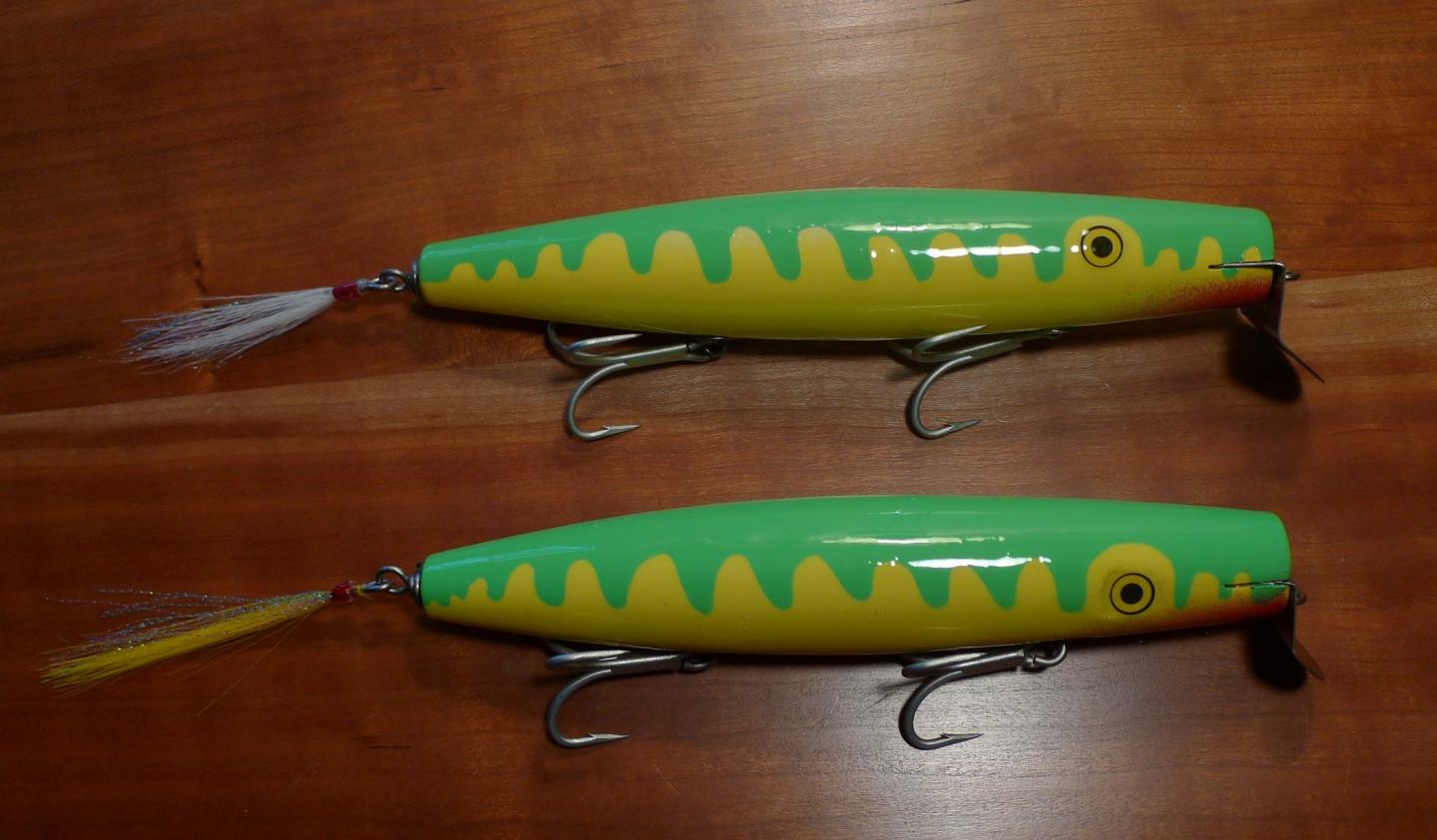 here are a matched set of parrot scalloped metal lip swimmers... one Musso 7.5" surface swimmer (SS) with lefty 2 Mid slot lip and a 7.5" Pine with Pikie 3 lip... I add a little more wt to my pines (about .15 to .2 OZ more lead in the Pine than the SS.