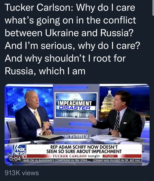 Then you have the useful idiot Tucker who suggested that Putin’s invasion is just a border dispute. He’s suggested that Biden is doing this to pay off imagined debts to Ukrainian Oligarchs. Tucker laid out Putin’s plan for costs to impose on Americans, in terms of energy costs. Tucker included every single false claim about Ukraine that Russia has been planting since 2016. Every single one.