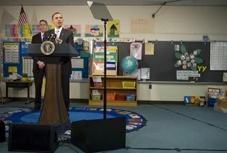 ...the press must have looked awfuly funny sitting in those tiny desks...I think you are giving the Teleprompter Twit far too much credit...that's a 1st grade classroom if I ever saw one....he needed a teleprompter for 1st graders.....not 6th graders....