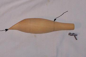 Ok... still working on this ... got shoulders now.. letting wood tell me wich side is up in the water and solved weighting issues..Arrows show where surface water (fresh) hits plug on real Nike.. front tip ,and 2" back from rear .. How the heck you going to weight a plug to sit in the water like that . Then Georges (Numbskull) xray came to mind and remembered seeing some rinky dinky wrapping around arse weight.. I wrapped lead around a smaller tailweight and removed lead until it sat perfect.. Had the hooks hanging off it too .. So I guess they weighted each plug individual... very labor intensive .. I was also surprised tanking my blanks to find the top . heavy side down .. sometimes face grain on the side sometimes on the bottom sometimes cockeyed .. Give the blank a spin after marking it always comes out the same way buit different from others .