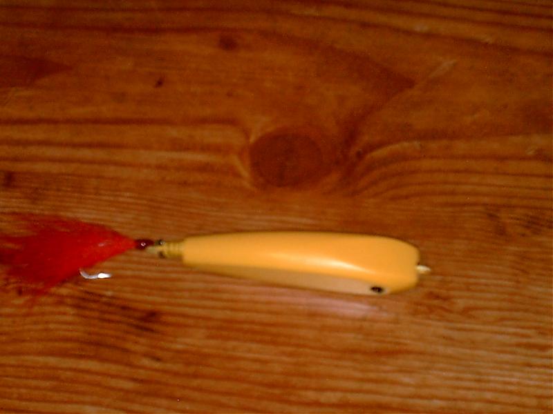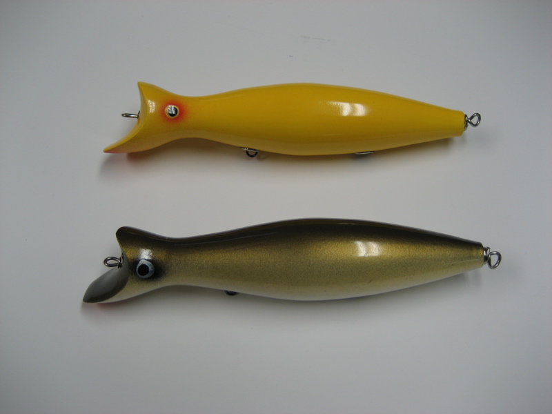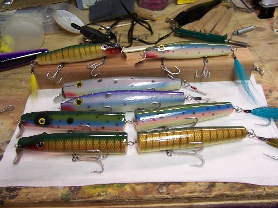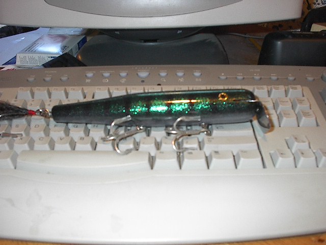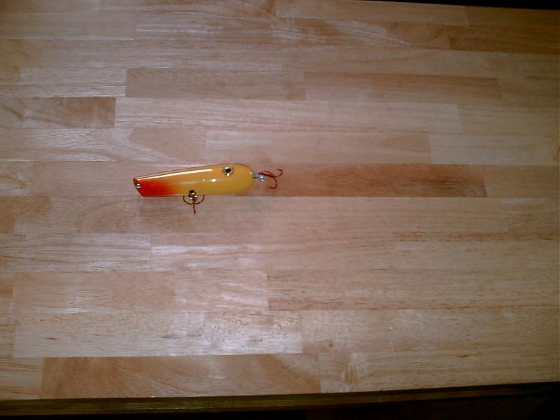 I drilled from the fat end to where the line attaches. Then I start the other end straight in and thed turn toward the rear. The way I've weighted them they lay dead flat in the water, because of where the line loop is it will leap up if twitched hard or slide if swept. It will also walk the dog. I only used a tail and a belly hook because a third hook is a PIA if you're not killing everything you catch. It's a plug that never was- a wooden reverse 40.