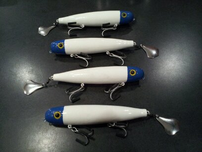 Ok, here they are. Mahogany, 7", 3.5 oz, stainless steel screw eyes, 3x VMC trebles. I work them like a spook and the flaptail really causes quite a bit of commotion. I first tried it unweighted, but decided to throw in a belly weight to help the action. This was a really enjoyable build as it forced me to stray out of my comfort zone. Hopefully you all like them and ChefChris catches with it. I have an extra for the upcoming auction of course.