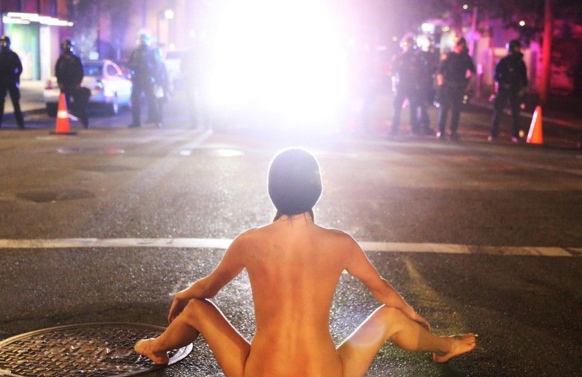 "Before it was over, she struck ballet poses and reclined on the street. She also sat on the asphalt in a yoga-like position, facing officers, before they left."