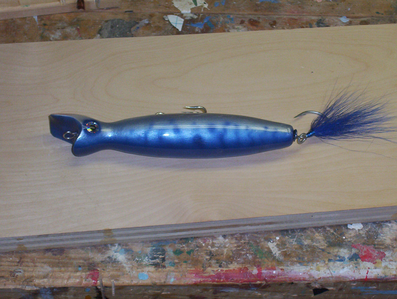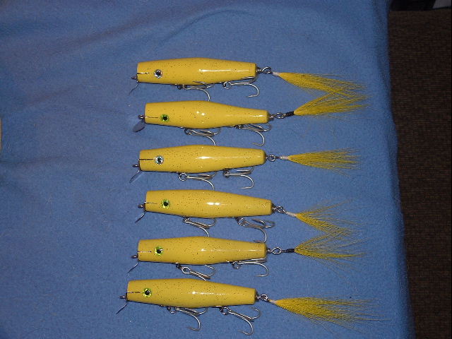 These are the plugs I had epoxy trouble with. They are a handcarved swimmers with glow in the dark eyes. You can't see the purple glittter on the bottom of the plugs. At least I know these will be used. Most of my pluggage ends up never seeing water. These are rookie design for me.