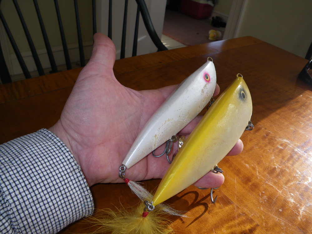 In the popper thread, Grapes mentioned how good ''all three sizes" of the Blue Streak popper were. Of course I only have the large, so naturally that drove me nuts. But when I noticed that Blue streak didn't bother with a different shape for their Jr atom, I guessed they would have used the same body for their Jr popper. Furthermore, on the xray I could see the large popper was weighted with two 3/4" weights, so it seemed likely that they used one 3/4 weight in the Jr popper.
