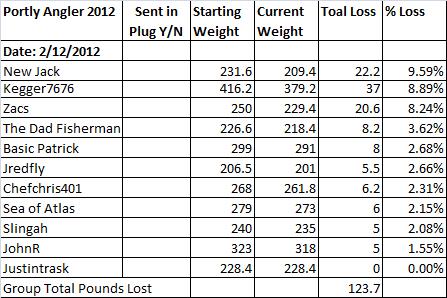 No change in standings New Jack and Kegger are doing great. Total weight loss for the Portly Angler team is 127 pounds. Lets see how quick we can get this over 200.
