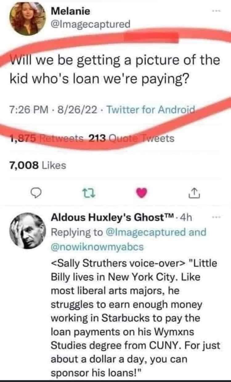 "all those hard working plumbers and electricians cooks and Walmart workers who the Republicans claim are getting screwed by Biden giving their kids 10k in debt relief. 99.9 % of them graduated from public schools"