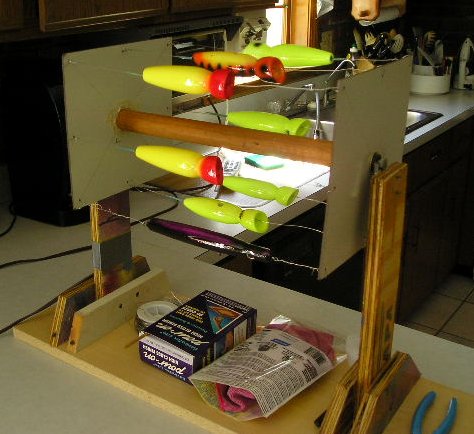 here's a pix of the rack i built out of scraps I had lying around. used a motor from a microwave turntable. i can do 8 at a time, possibly more if I doubled them up.