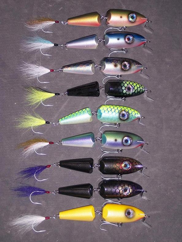 These are my regular 2.5oz(aprox) Jointed BigEye Swimmers. I have very limited numbers of them in the colors pictured below. I will list them by color from top to bottom along with the quantity available. PM me color and quantity. I'll toss out the same deal that Mac does - 4 or more and I'll pay shipping - otherwise its $5 shipped priority. Plugs are $25 each.