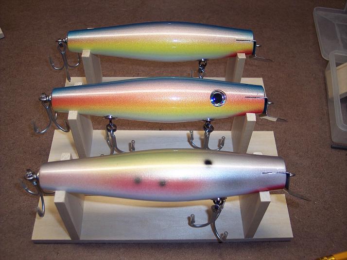 Working on some new styles and colors and I just wired a few up! Thought you might like a preview of what you might find at the upcoming fishing shows this season!  Here are the new 3 oz. Dannies! They will come both "blind" and with eyes and also with 2 belly trebles and single belly trebles! Pictured is a color combo you have seen before....the classic "Rainbow"! Also a blind bunker!