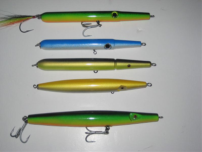 Odds and ends type stuff. The top and bottom fire tigers have been posted before and are included for size reference. The three middle plugs are new. One is a standard size BM 2.5oz skin needle, the other downsized Hab and BM wadd knockoffs...... to use for little fish when I go to Flap's spots.