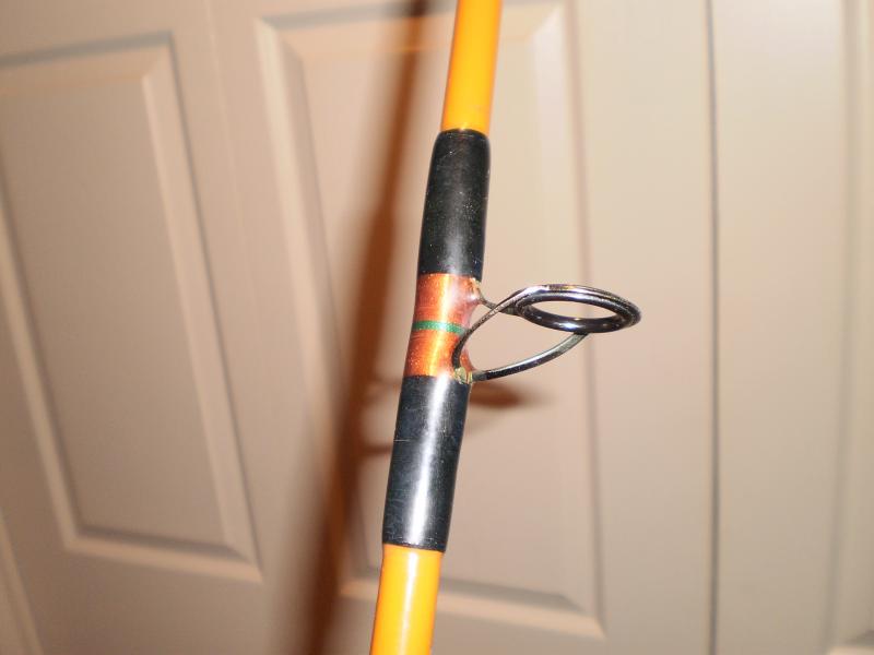 Not sure what model blank this was built on... It is wrapped conventional with a trigger finger and Pac-Bay guides. Kept it in very nice condition. Used it mainly as a smaller chunking rod, but for the open beaches I normally fish, I just needed something a little longer. Makes for an awesome jetty rod... or if you just like smaller heavers from plugs and such. Can email better pics if interested. My brother measured the length from the butt to the reel seat and said it was between 25"-26". I'm not sure if he measured right to the middle or what....