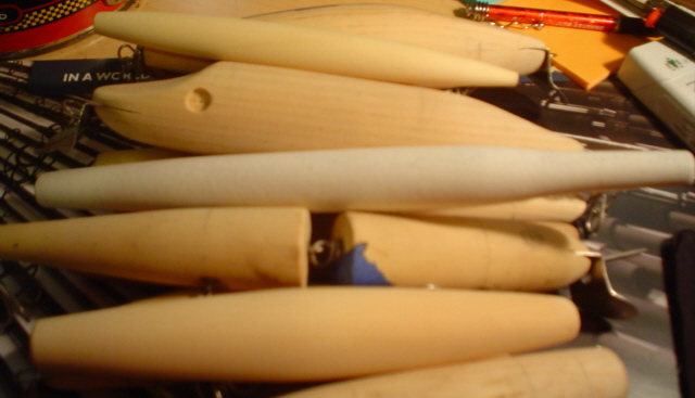 like the skinny profile ,,, is it rolly ? You get it to swim ... That little dark one with the big eye is interresting .. Lots of unfinished stuff there .. Looks like the Proffesor's cave . I thought he was going commercial making plug kits ..