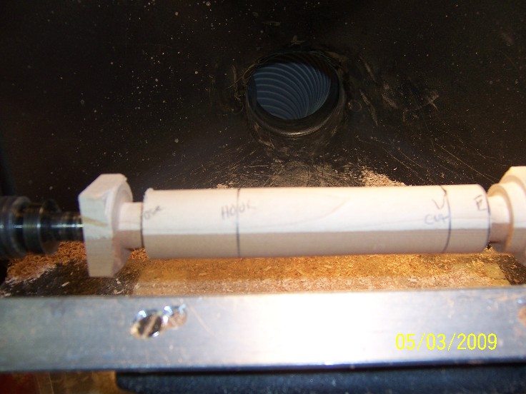 once the blank is on the lathe, make two marks on one of the flats, 6" appart to mark the front half of the plug ( beggining and end) this will be repeated with the secnd piece for the rear half, be sure to leave the square ends, you will need them.. once the blank is marked, even though you only marked one flat, you will be able to see the ghost image and using your roughing gouge, turn the blank to a round cylinder that will be 7/8" in diameter when it's sanded, so leave a little extra... a word of caution.... use SHARP tools, becase of the difference in wood densities, dull tools are a bad omen... for safety, please wear a full face shield... eye goggles dont help when a blank or errant hunk of wood whacks you in the cheek...