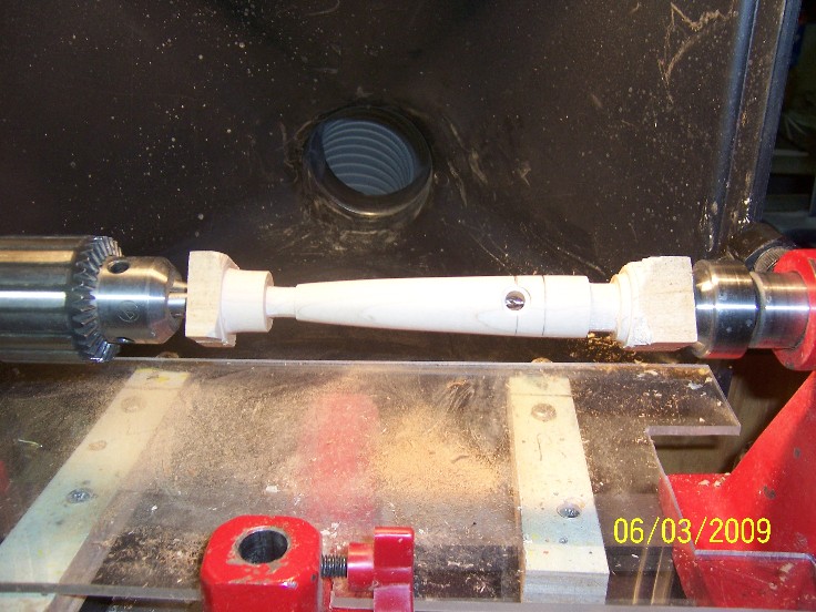 you will find that when you chuck up the blank on the lathe that it wants to move towards the cedar, or soft wood, this is OK, when you turn the blank, you will be removing a little more of the denser maple than the softer, more boyant cedar, it was part of the plan, originaly, I made the maple 1/4" thicker so I could drilll into the maple...long story short, it was a bad idea and the plug was too bottom heavy, alot of the action was lost..
