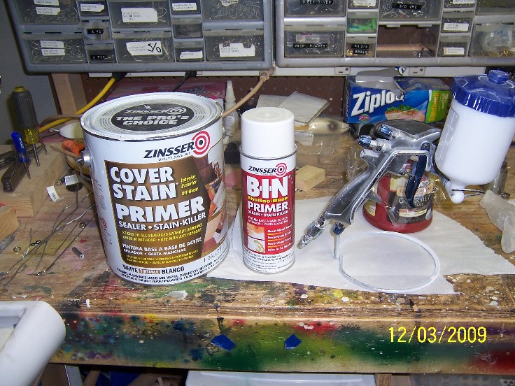 Priming... normaly, I use Zinsser oil based cover stain over my BLO ( oil over oil) and apply it with an automotive type spray gun ( I've got a 850 cfm blower in my paint hood that exausts outside)but in cases like this where the plug is sealed with something other than BLO, I'll use the Zinsser shelac based primer , the plug will have a glass like finish, IMHO, not good for paint adhesion, so I scuff the plug body up with #220 paper... remove your wire and give the plug one final inspection, be sure the through hole is clear, it is alot eaiser now to do a repair then it is after you have the plug painted and then discover the through hole is blocked!
