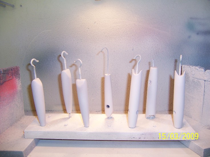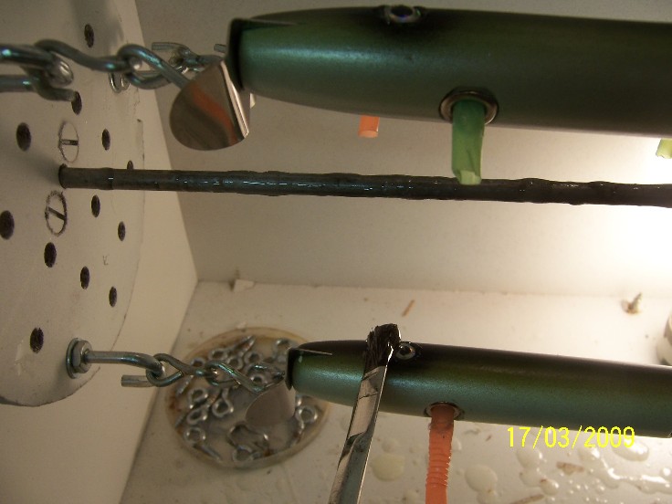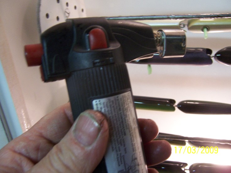 once each plug is coated, I like to look at each plug as it spins under different light and agles, checking for "holidays" or bare spots, last year, I started "flaming" each plug using a small propane torch, the carbon dioxide ( just like when you exhale on them) breaks the tiny gas bubbles, thsi is not entirely nessary, most of the bubbles will disapear on their own, but by flaming the plug ( 4-5" away or you WILL catch them on fire) it gives the finish a glass like look, also if you should discover a bad spot when the epoxy first starts to thicken, a light application of heat will alow you to repair the spot... this can be done for about the first hour.. it depends on the temp in the room ( or spinner)