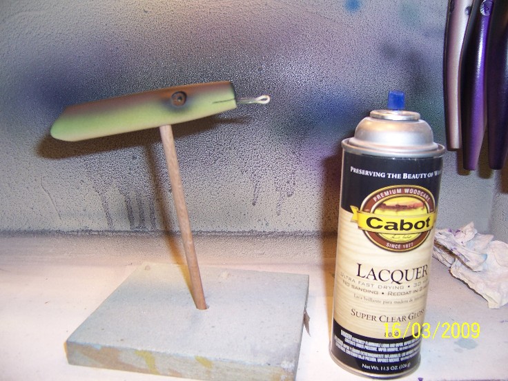the eyes... one of the few problems I ever had with envirotex was on ocassion I had foaming of the eyes, it was a randome thing, after much head scratching a nd a little reading, i figured out the problem, seems the tiny divit made by the forshner bit trapped an air pocket in the plug, my spinner is heated with apair of 40 watt light bulbs, as the trapped air expanded, it caused micrscopic bubbles, much like an areator to from, I could hit them with the torch and they would disappear, but, seeing as both my spinners have timers, I like the Ron Propeal approach... set it and for get it!... so, now using a wooden q tip that I have sharpend the wooden endon, I apply a thin coating of 5 minute epoxy to the eye hole, smoothing it along the whole eye socket, one it becomes tacky, I apply the eye... no more eye rabies!