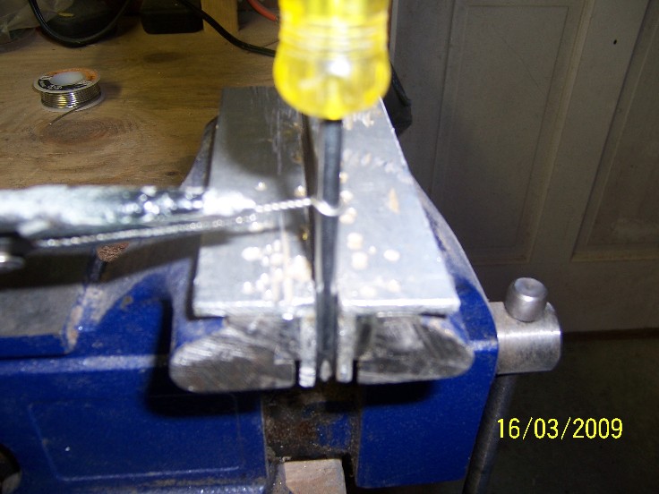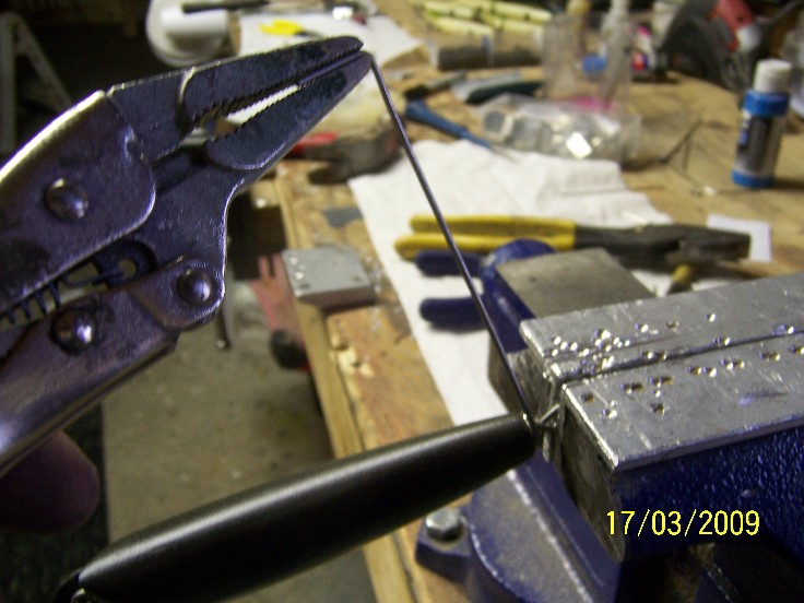 now get your tail piece., select a length of wire, the factory loop is too large, you must form another, start by bending approx 2" of wire arond a small pair of needle nose pliars, pusing the round jaws of the pliears as tight as possible inside the loop bend each "leg" out at about a 45degerre angle, then close the loop, like all thing sin plug making, practice makes perfect... this loop should be considerably smaller than the factory one.... if it's not..DO IT AGAIN!
