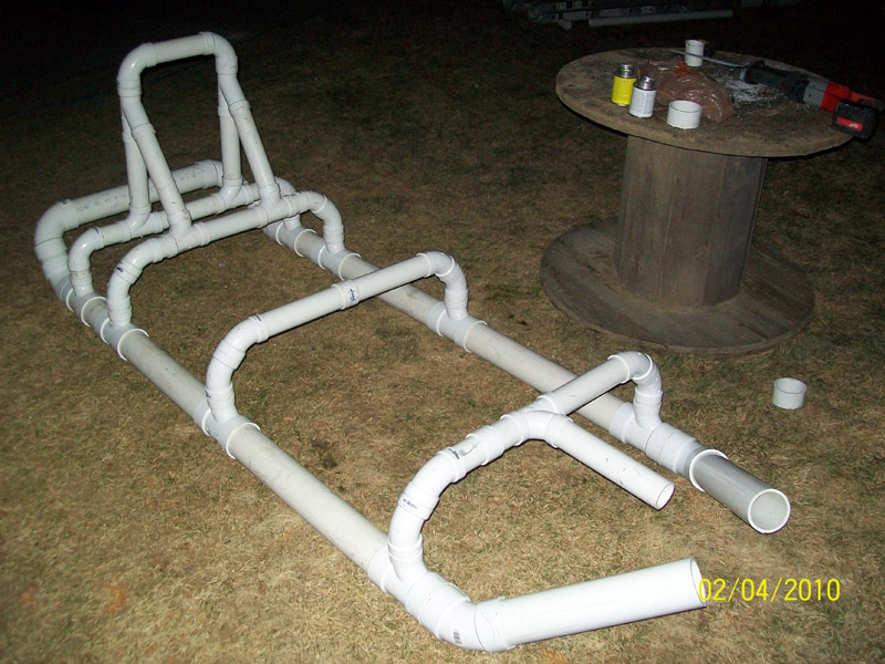 The front of the sled isn't finished I need to put on 2-45 degree fittings to give a blunt nose and between the two fittings will be a Tee going back to the main frame then put plywood on top of the base and place some sides on it.