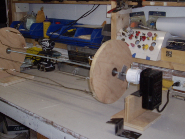 I see Bruce posted the picture of the twin towers....the bottom one was the first one I ever made, it was made from scraps... I only purchased the light bulbs... The motor was from an old oil skimmer, the gears and pulleys came from an old copy machine...3/8 threaded rod was used for the adjustment and threaded through F&M plates scrounged from work.. I used swivels from my tuna hand lines... the new one, is powered by a rotissery motor, all the belts and pulley bought from McMaster carr.. I did spend a bit of money on that one...George is right about the gear motor, pricey, but you will only buy it once...if and when either motor goes,I'll replace them with a gear motor...BTW... the first one still is going strong... i keep waiting for the copy machine belts to break, but it has not happend yet...
