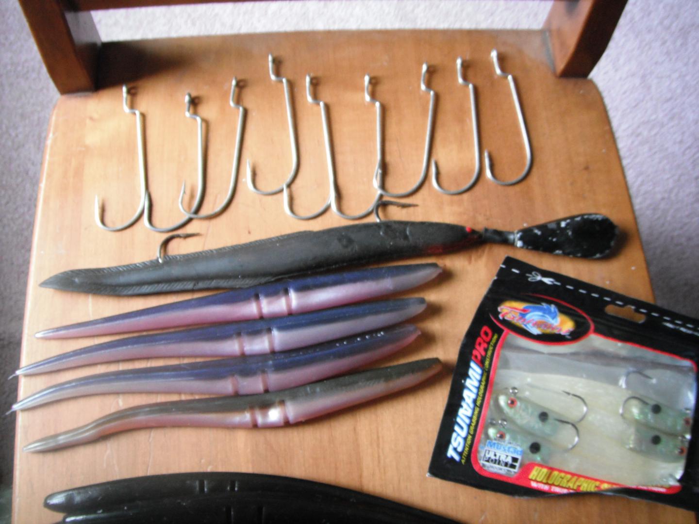 9 black sluggos, 4 other ones, 9 sluggo hook, Spro rigged eel, and pack of swim shads. $30 shipped.