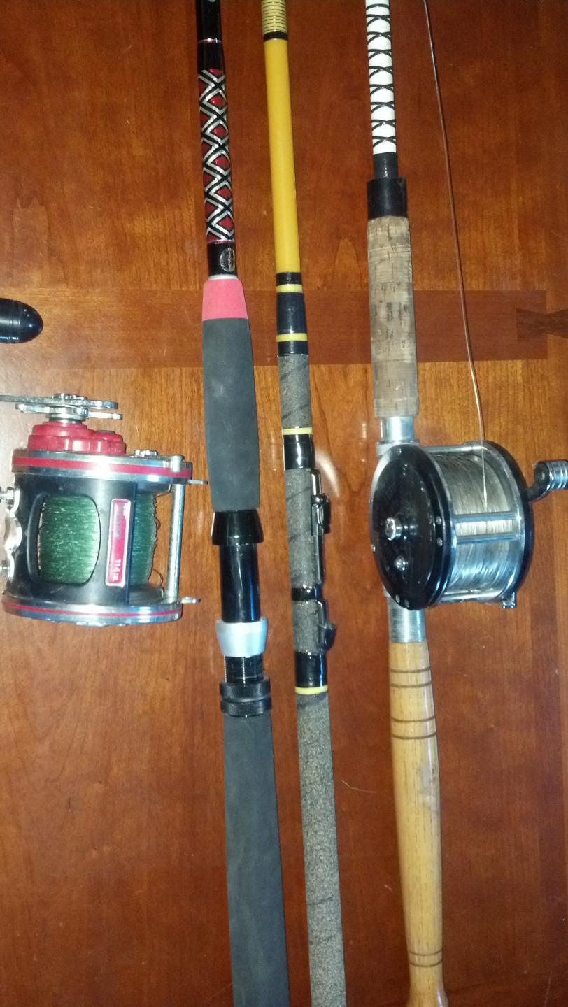 3) South bend 6'6" 30-50 lb class rod with bottom roller and tip roller, the other guides are hardloy. It has a wood butt with a chrome gimble and a cork fore grip. The reel is a Penn No. 149 in nice condition spooled with Monel trolling wire. Not sure last time it was serviced, but its in good overall condition. $35.00