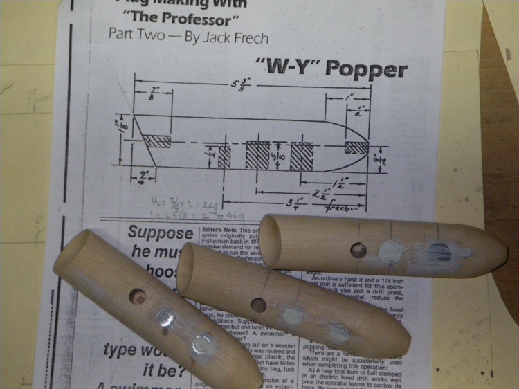 First a few WY Poppers. Frech claimed this (and an A40) where his most productive plugs. Supposedly he used them at night. Birch and heavy. He is vague on how to weight them. The diagram shows two huge 1/2" by 5/8" weights (which yields a 4 oz plug), his article talks about casting 1/2 by 3/8 weights for the plug (3 oz end result). I did both but think the lighter one is right.